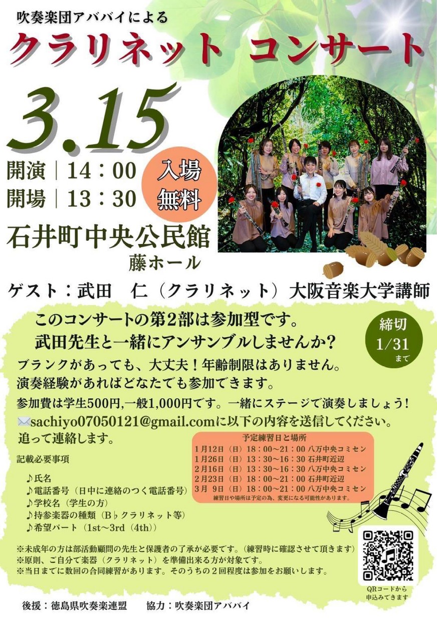 吹奏楽団アババイのクラリネットパートが演奏会を開催します。